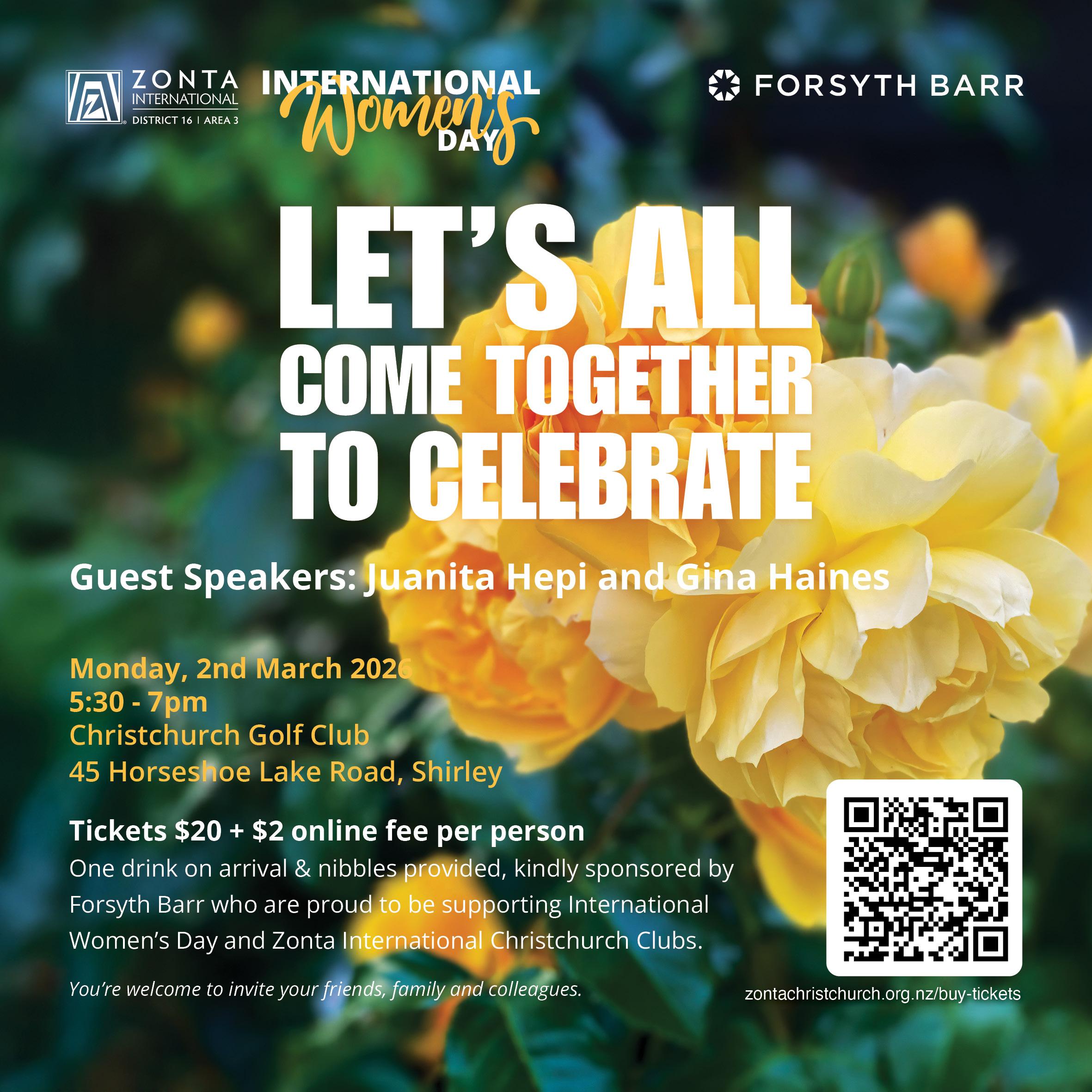 One drink on arrival & nibbles provided, kindly sponsored by Forsyth Barr who are proud to be supporting International Women’s Day and Zonta International Christchurch Clubs